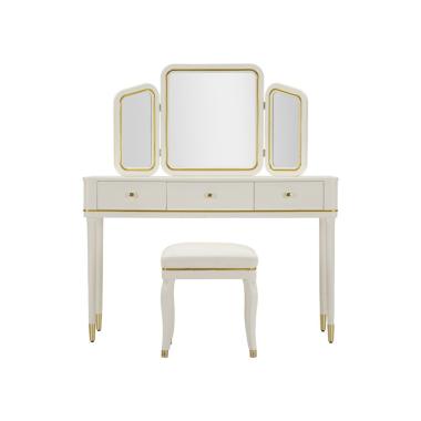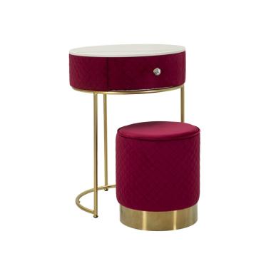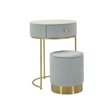 Comodino/toletta con puff coordinato in velluto celeste, dettagli dorati e design elegante. Ideale per aggiung...