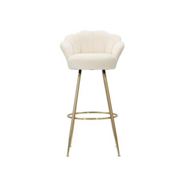 Sgabello bar in velluto color crema con gambe dorate dal particolare design che richiama i petali di un fiore....