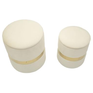 Duo di puff in velluto verde con fascia dorata. Funzionali e decorativi, perfetti per ogni ambiente.