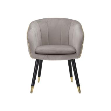 Poltrona in tessuto grigio imbottito con rifiniture dorate e gambe in legno nero con dettagli in oro. L'elegan...