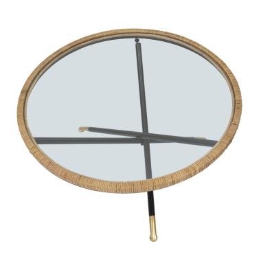 Tavolo da caffè rotondo con struttura in metallo nero e piano in vetro incorniciato in un intreccio di rattan...