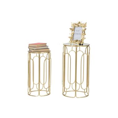 Elegante coppia di tavolinetti rotondi in metallo dorato con piano in vetro a specchio dalle linee geometriche...
