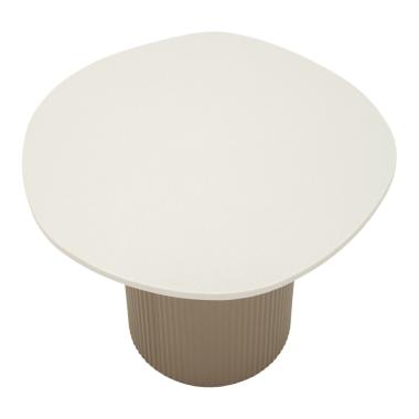 Tavolo da pranzo rettangolare in legno bianco dalle linee semplici ed essenziali con piano in legno marrone.