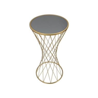 Tavolinetto rotondo in metallo dorato dalla struttura semplice e dalle linee essenziali con piano in vetro a s...