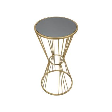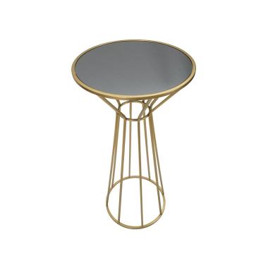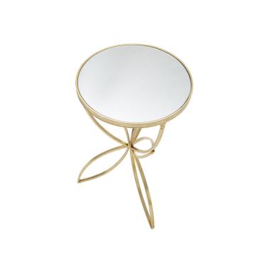 Tavolinetto rotondo in metallo dorato dalle linee semplici ed essenziali con piano in vetro a specchio.