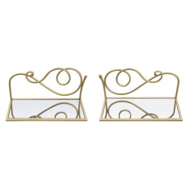 Elegante coppia di mensole da parete in metallo dorato con ripiano in vetro a specchio dalle linee morbide e s...