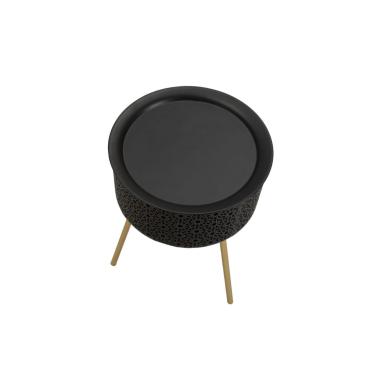 Tavolinetto rotondo in metallo nero con gambe dorate. La parte superiore è finemente intagliata per donare un...
