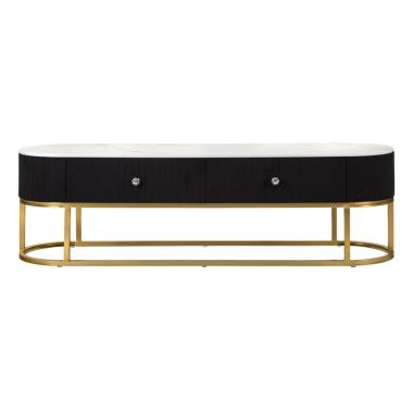 Mobile porta tv con i lati smussati con cassetto. La struttura in metallo dorato, la parte superiore rivestita...