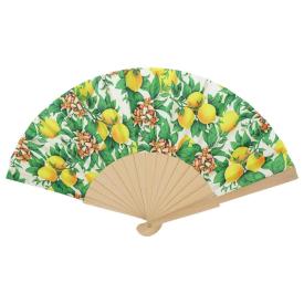 Ventaglio in tessuto e manico di legno, con temi siciliani.